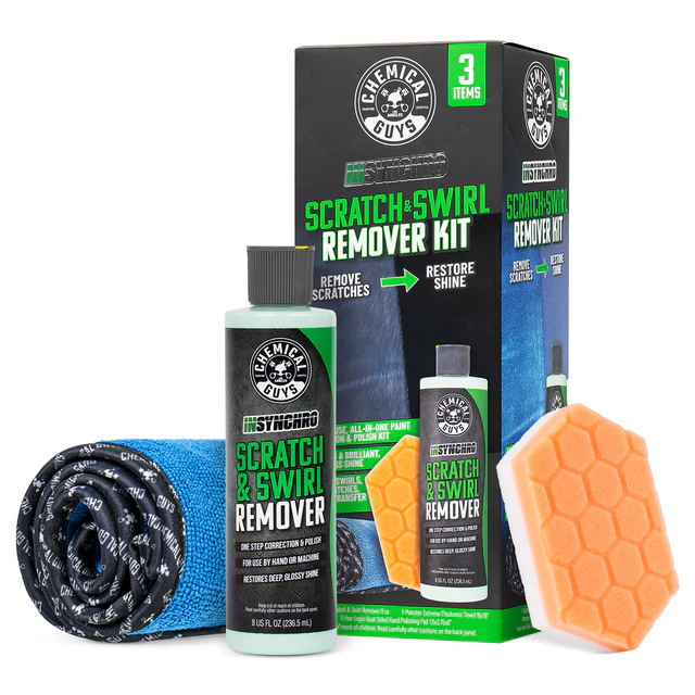 This kit lets you correct light to medium scratches, swirls, water spots, and other common paint defects without using a machine polisher. InSynchro Scratch & Swirl Remover uses advanced adaptive abrasives to restore clarity and shine to paint in one simple step, blending the cutting ability of a compound with the glossy finish of a polish, letting you achieve exceptional results in fewer passes.