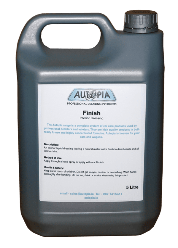 Autopia finish liquid dressing, also known as D-Matte, is an innovative interior liquid dressing providing a natural matte lustre finish to dashboards and all interior trims. Available in 500ml, 1 litre and 5 litre.